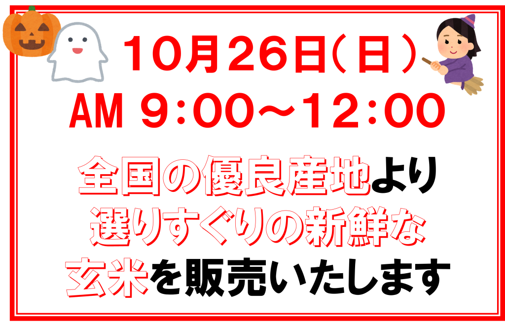 さて、10月度蔵出し玄米販売を10月26日(日)AM9:00~12:00で実施いたします。