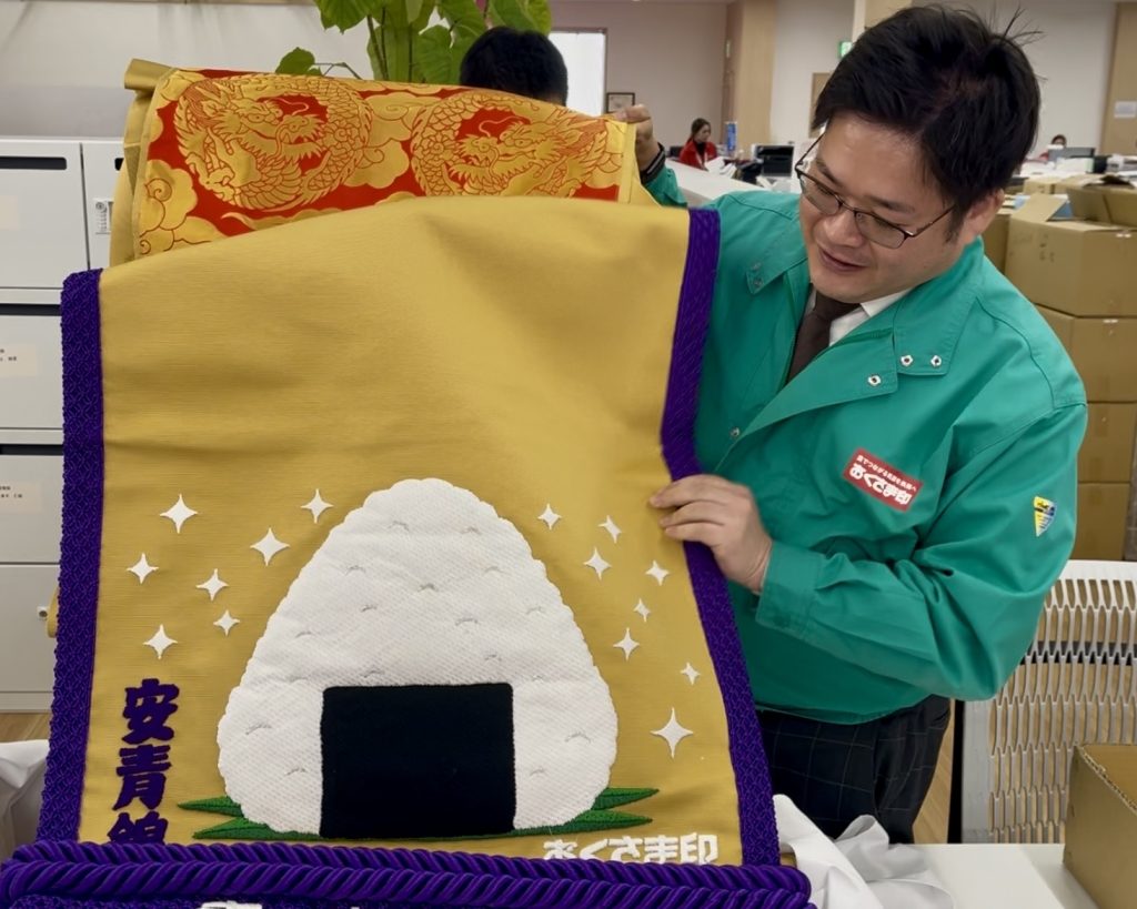 今年は、そのご縁から化粧まわしを贈らせていただくこととなり、大きなおむすびの刺繍をあしらった「お米の幸南食糧」らしいデザインにいたしました。